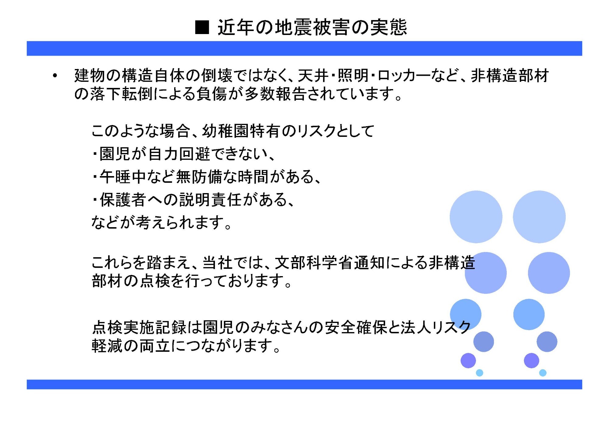 2025/11/1 今後は幼稚園施設の非構造部材の検査も必要になると思われますので、お気軽にご相談ください。